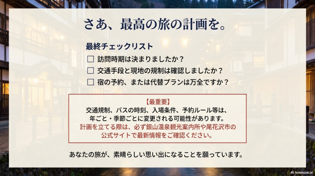 なお、銀山温泉の交通規制内容、シャトルバスの運行時間、入場制限、宿泊予約条件などは、年ごと・季節ごとに変更される可能性があります。計画を立てる際は、必ず銀山温泉公式サイトや尾花沢市の公式発表、各旅館の公式情報を確認し、最新情報をもとに判断してください。