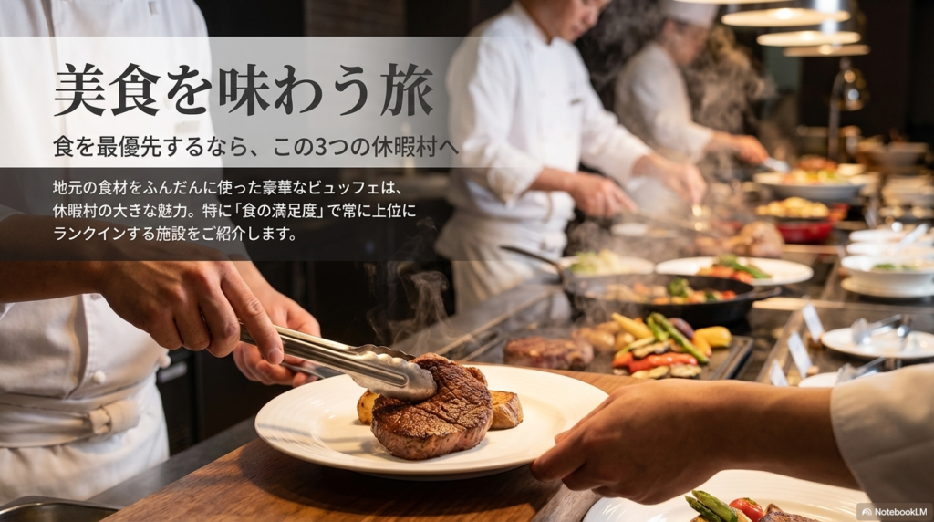国民休暇村といえば、地元の食材をふんだんに使ったバイキングが大きな楽しみの一つです。最近は「ライブキッチン」を導入する施設が増えており、目の前で牛ステーキを焼いてくれたり、揚げたての天ぷらを提供してくれたりと、視覚的にも楽しませてくれます。