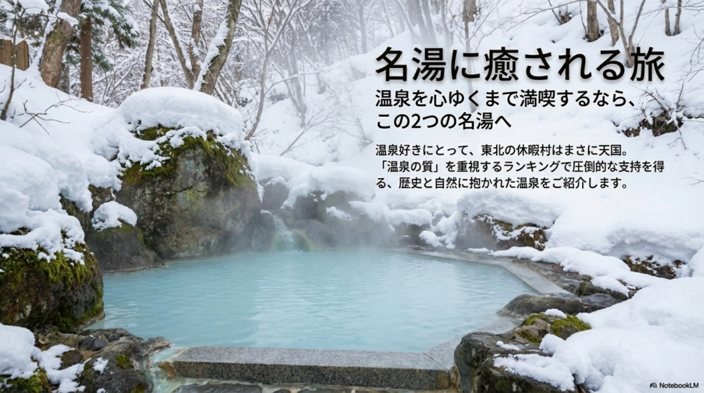 - 泉質にこだわるなら「岩手網張温泉」「乳頭温泉郷」